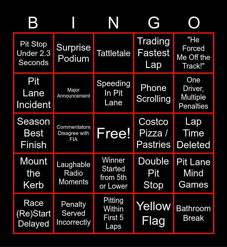 This bingo card has a free space and 95 words: Rain/Wind, Red Flag, Yellow Flag, First Podium, Double Podium, DNF, DNQ/DNS, Penalty Served Incorrectly, Car Has Technical Issues, Contact (no retirements), Crash (at least 1 retirement), Team Orders, Track Limits Violation, Speeding In Pit Lane, Pit Stop Over 7 Seconds, Pit Stop Under 2.3 Seconds, One Driver, Multiple Penalties, Driver Starts from Pit Lane, As Seen On DTS, Order Changes After Race, Double DNFs, 3+ DNFs, Rookie Driver, Podium has no WDC, Trading Fastest Lap, Pit Lane Incident, Fell Asleep, Phone Scrolling, Overtaking Off Track, DRS Train 10+ Cars, Laughable Radio Moments, 3+ Celebrity Sightings, Big Lock Up/Spin, Race Winner Didn't Start On Pole, Race (Re)Start Delayed, Winning Gap <1 or >5 Seconds, Pitting Within First 5 Laps, Smoke/Fireworks, Season Best Finish, Win/DNF At Home Race, Pit Lane Mind Games, Commentators Disagree with FIA, Winner Started from 5th or Lower, "He Forced Me Off the Track!", Double Pit Stop, Costco Pizza / Pastries, 3+ Penalties, MacLeod Leaves, Team on Team Crime, "___ Is On Another Level", (Virtual) Safety Car, Penalty From Prior Race/Qualifying, Race Leader Retires, Race Lead Changes 3+ Times, Successful Undercut, +/- 3 or more positions on Lap 1, Merch From Bottom 5 Teams, enTIRE Grid, Double Points for Any Bottom 5 Team, Yellow Flag Jump Scare, Major Announcement, Driver's Family on Camera, Front Wing Replacement, Last Lap Overtake, Poor Strategy Call, No DNFs, 1 Podium 1 No Points, Top Team Not on Podium, Tattletale, Someone Cries, Damage to Side Pods/Wing, Mentions the Podcast, Bathroom Break, Tire Talk, 3 Wide, Found the Grass/Gravel, Cut to Reserve Driver, Turn/Lap 1 Incident, 3 Tire Types, Surprise Podium, 3+ Pit Stops, Brush the Barrier, Back the Grid Up, "Jim" Look, Lap Time Deleted, Mount the Kerb, Transponder Issue, Champ Leader Retires, Fun Hat, Dump Truck, Commentator's Curse, 5+ Investigations, Who is that?, Dead Name and Just an Incident.