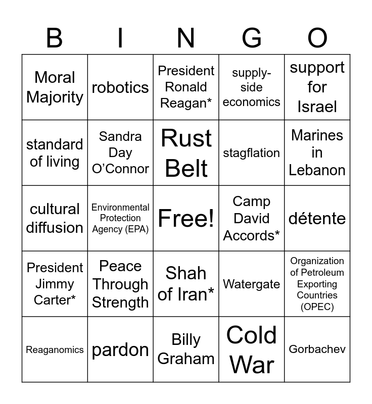 This bingo card has a free space and 31 words: Billy Graham, Endangered Species Act(s)*, Environmental Protection Agency (EPA), Heritage Foundation, Moral Majority, President Ronald Reagan*, Sandra Day O’Connor, Watergate, Camp David Accords*, Cold War, détente, Gorbachev, Iran Hostage Crisis*, Iran-Contra Affair*, Marines in Lebanon, Middle East normalization, Organization of Petroleum Exporting Countries (OPEC), Peace Through Strength, President Jimmy Carter*, Shah of Iran*, support for Israel, internet*, Reaganomics, robotics, stagflation, standard of living, supply-side economics, cultural diffusion, pardon, Rust Belt and Sun Belt.