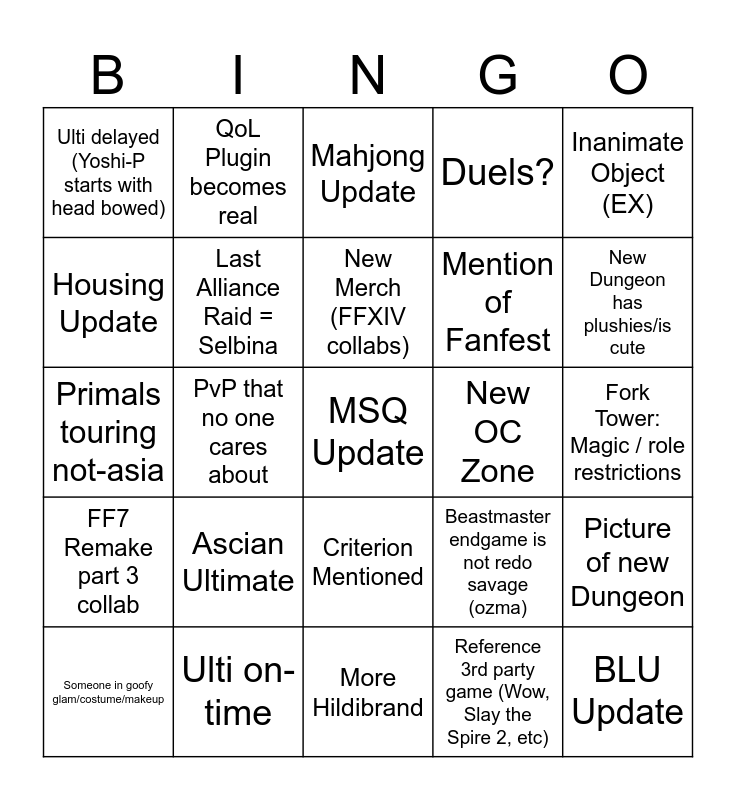 This bingo card has a free space and 24 words: Ascian Ultimate, Ulti on-time, New Merch (FFXIV collabs), Someone in goofy glam/costume/makeup, Inanimate Object (EX), Ulti delayed (Yoshi-P starts with head bowed), Housing Update, QoL Plugin becomes real, New OC Zone, Criterion Mentioned, Mention of Fanfest, Primals touring not-asia, Beastmaster endgame is not redo savage (ozma), Picture of new Dungeon, Last Alliance Raid = Selbina, Reference 3rd party game (Wow, Slay the Spire 2, etc), Fork Tower: Magic / role restrictions, Mahjong Update, New Dungeon has plushies/is cute, PvP that no one cares about, BLU Update, FF7 Remake part 3 collab, Duels? and More Hildibrand.