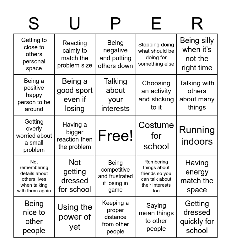This bingo card has a free space and 24 words: Not getting dressed for school, Using the power of yet, Talking about your interests, Being nice to other people, Being silly when it’s not the right time, Getting to close to others personal space, Being a positive happy person to be around, Reacting calmly to match the problem size, Costume for school, Being competitive and frustrated if losing in game, Choosing an activity and sticking to it, Getting overly worried about a small problem, Rembering things about friends so you can talk about their interests too, Having energy match the space, Being a good sport even if losing, Saying mean things to other people, Running indoors, Being negative and putting others down, Talking with others about many things, Having a bigger reaction then the problem, Getting dressed quickly for school, Not remembering details about others lives when talking with them again, Stopping doing what should be doing for something else and Keeping a proper distance from other people.