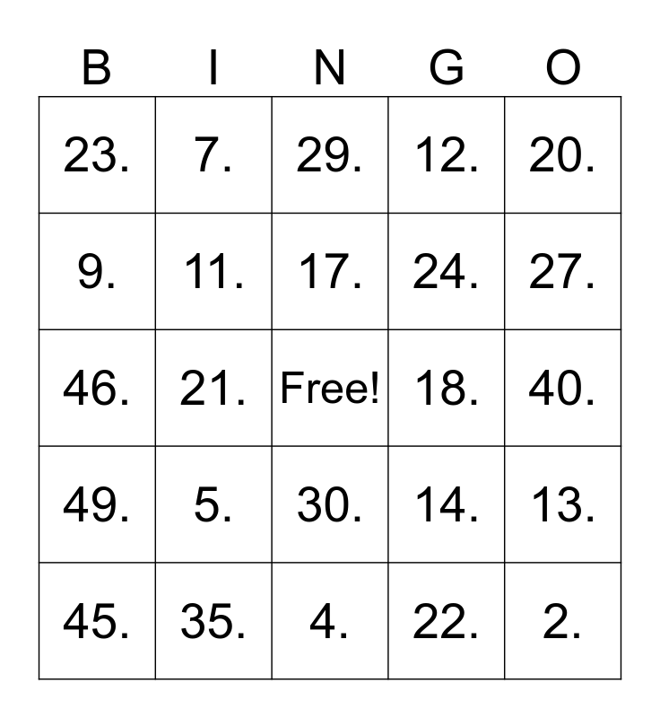 This bingo card has a free space and 50 words: 1., 2., 3., 4., 5., 6., 7., 8., 9., 10., 11., 12., 13., 14., 15., 16., 17., 18., 19., 20., 21., 22., 23., 24., 25., 26., 27., 28., 29., 30., 31., 32., 33., 34., 35., 36., 37., 38., 39., 40., 41., 42., 43., 44., 45., 46., 47., 48., 49. and 50..