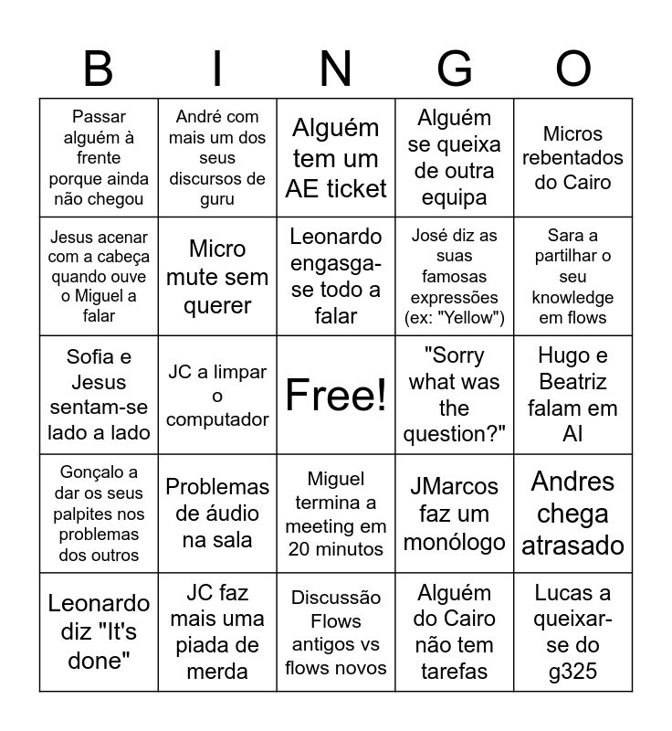 This bingo card has a free space and 24 words: Problemas de áudio na sala, JC faz mais uma piada de merda, Leonardo engasga-se todo a falar, Leonardo diz "It's done", Micros rebentados do Cairo, Passar alguém à frente porque ainda não chegou, Jesus acenar com a cabeça quando ouve o Miguel a falar, André com mais um dos seus discursos de guru, "Sorry what was the question?", Miguel termina a meeting em 20 minutos, José diz as suas famosas expressões (ex: "Yellow"), Sofia e Jesus sentam-se lado a lado, JMarcos faz um monólogo, Andres chega atrasado, Micro mute sem querer, Alguém do Cairo não tem tarefas, Hugo e Beatriz falam em AI, Alguém tem um AE ticket, Sara a partilhar o seu knowledge em flows, JC a limpar o computador, Lucas a queixar-se do g325, Gonçalo a dar os seus palpites nos problemas dos outros, Alguém se queixa de outra equipa and Discussão Flows antigos vs flows novos.