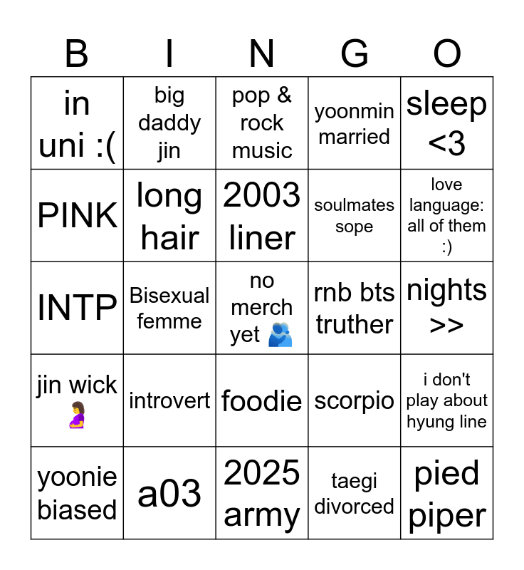 This bingo card has a free space and 24 words: introvert, a03, 2003 liner, yoonie biased, sleep <3, in uni :(, PINK, big daddy jin, rnb bts truther, foodie, soulmates sope, INTP, scorpio, i don't play about hyung line, long hair, taegi divorced, nights >>, pop & rock music, love language: all of them :), Bisexual femme, pied piper, jin wick 🤰, yoonmin married and 2025 army.