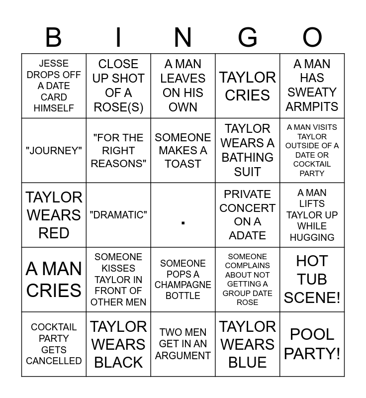 This bingo card has a free space and 24 words: SOMEONE KISSES TAYLOR IN FRONT OF OTHER MEN, TAYLOR WEARS BLACK, SOMEONE MAKES A TOAST, COCKTAIL PARTY GETS CANCELLED, A MAN HAS SWEATY ARMPITS, JESSE DROPS OFF A DATE CARD HIMSELF, "JOURNEY", CLOSE UP SHOT OF A ROSE(S), PRIVATE CONCERT ON A ADATE, SOMEONE POPS A CHAMPAGNE BOTTLE, TAYLOR WEARS A BATHING SUIT, TAYLOR WEARS RED, SOMEONE COMPLAINS ABOUT NOT GETTING A GROUP DATE ROSE, HOT TUB SCENE!, "FOR THE RIGHT REASONS", TAYLOR WEARS BLUE, A MAN LIFTS TAYLOR UP WHILE HUGGING, A MAN LEAVES ON HIS OWN, A MAN VISITS TAYLOR OUTSIDE OF A DATE OR COCKTAIL PARTY, "DRAMATIC", POOL PARTY!, A MAN CRIES, TAYLOR CRIES and TWO MEN GET IN AN ARGUMENT.