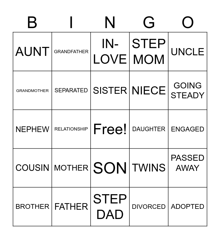 This bingo card has a free space and 24 words: MOTHER, FATHER, SISTER, BROTHER, UNCLE, AUNT, GRANDMOTHER, GRANDFATHER, DAUGHTER, SON, NIECE, NEPHEW, TWINS, PASSED AWAY, SEPARATED, DIVORCED, ENGAGED, IN-LOVE, GOING STEADY, RELATIONSHIP, ADOPTED, COUSIN, STEP MOM and STEP DAD.
