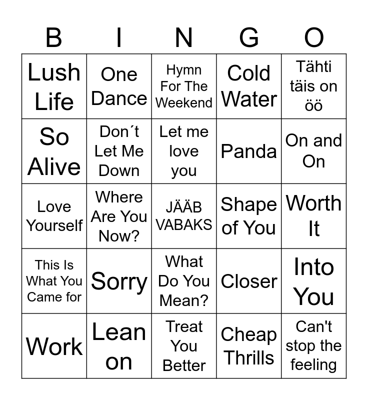 This bingo card has a free space and 24 words: Sorry, Lean on, Let me love you, Work, Tähti täis on öö, Lush Life, So Alive, One Dance, Shape of You, What Do You Mean?, Panda, Love Yourself, Closer, Into You, Don´t Let Me Down, Cheap Thrills, Worth It, Hymn For The Weekend, On and On, Where Are You Now?, Can't stop the feeling, This Is What You Came for, Cold Water and Treat You Better.