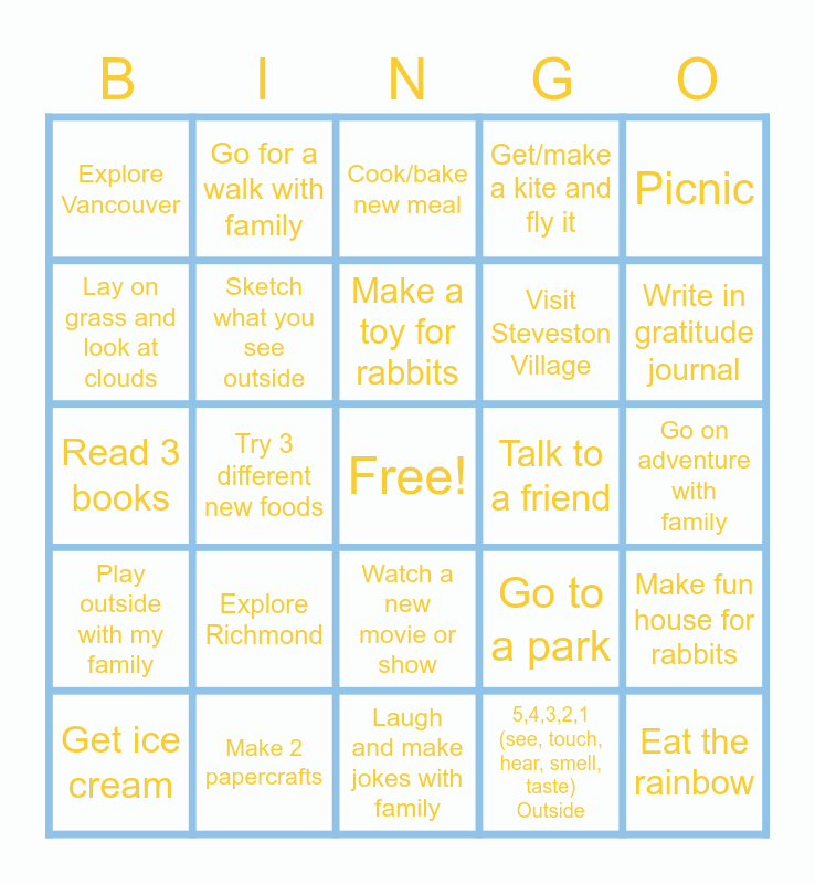 This bingo card has a free space and 24 words: Explore Richmond, Make 2 papercrafts, Make a toy for rabbits, Get ice cream, Picnic, Explore Vancouver, Lay on grass and look at clouds, Go for a walk with family, Talk to a friend, Watch a new movie or show, Visit Steveston Village, Read 3 books, Go to a park, Make fun house for rabbits, Sketch what you see outside, 5,4,3,2,1 (see, touch, hear, smell, taste) Outside, Go on adventure with family, Cook/bake new meal, Write in gratitude journal, Try 3 different new foods, Eat the rainbow, Play outside with my family, Get/make a kite and fly it and Laugh and make jokes with family.