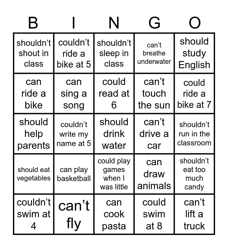 This bingo card has a free space and 24 words: can play basketball, can’t fly, could read at 6, couldn’t swim at 4, should study English, shouldn’t shout in class, can ride a bike, couldn’t ride a bike at 5, can’t drive a car, could play games when I was little, can’t touch the sun, should help parents, can draw animals, shouldn’t eat too much candy, can sing a song, could swim at 8, shouldn’t run in the classroom, shouldn’t sleep in class, could ride a bike at 7, couldn’t write my name at 5, can’t lift a truck, should eat vegetables, can’t breathe underwater and can cook pasta.