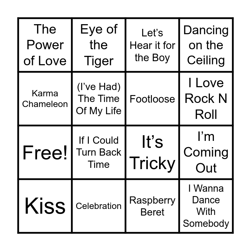 This bingo card has 60 words: All Night Long, Billie Jean, Wake Me Up Before You Go-Go, I Wanna Dance With Somebody, Girls Just Wanna Have Fun, Material Girl, Footloose, Walking on Sunshine, Free!, I’m So Excited, Dancing on the Ceiling, Uptown Girl, (I’ve Had) The Time Of My Life, Flashdance… What a Feeling, Heaven is a Place on Earth, The Power of Love, Kiss, Karma Chameleon, La Bamba, I Love Rock N Roll, Celebration, Let’s Hear it for the Boy, Summer of ‘69, Mony Mony, Pour Some Sugar On Me, Glory Days, You Make My Dreams (Come True), Higher Love, If I Could Turn Back Time, How Will I Know, Danger Zone, Born In The U.S.A., You Can Call Me Al, Livin’ On A Prayer, Eye of the Tiger, Faith, Candy Girl, I’m Coming Out, Love Shack, It’s Tricky, Start Me Up, I Think We’re Alone Now, Raspberry Beret, Straight Up, Ghostbusters, Rhythm of the Night, The Heat is On, The Final Countdown, Smalltown Boy, Dress You Up In My Love, Shout To The Top, Hold On Tight (To Your Dreams), Take On Me, Walk Of Life, Lets Dance, Two Hearts, Part Time Lover, Hungry Eyes, Black Velvet and Rock The Casbah.