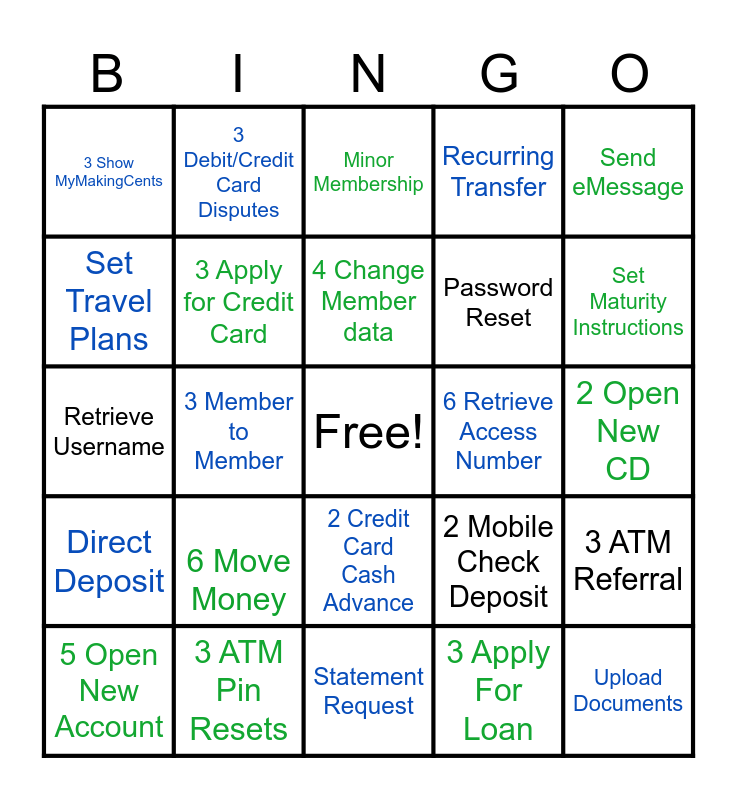 This bingo card has a free space and 24 words: 6 Move Money, 3 ATM Pin Resets, 4 Change Member data, 5 Open New Account, Send eMessage, 3 Show MyMakingCents, Set Travel Plans, 3 Debit/Credit Card Disputes, 6 Retrieve Access Number, 2 Credit Card Cash Advance, Password Reset, Retrieve Username, 2 Mobile Check Deposit, 3 ATM Referral, 3 Apply for Credit Card, 3 Apply For Loan, 2 Open New CD, Minor Membership, Set Maturity Instructions, 3 Member to Member, Upload Documents, Direct Deposit, Recurring Transfer and Statement Request.