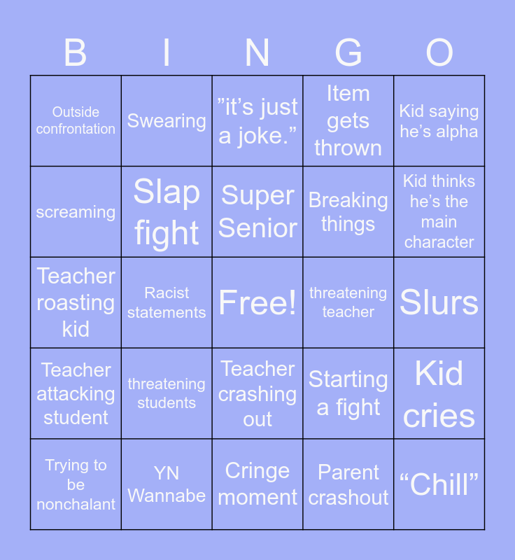 This bingo card has a free space and 24 words: threatening students, YN Wannabe, Super Senior, Trying to be nonchalant, Kid saying he’s alpha, Outside confrontation, screaming, Swearing, threatening teacher, Teacher crashing out, Breaking things, Teacher roasting kid, Starting a fight, Kid cries, Slap fight, Parent crashout, Slurs, ”it’s just a joke.”, Kid thinks he’s the main character, Racist statements, “Chill”, Teacher attacking student, Item gets thrown and Cringe moment.