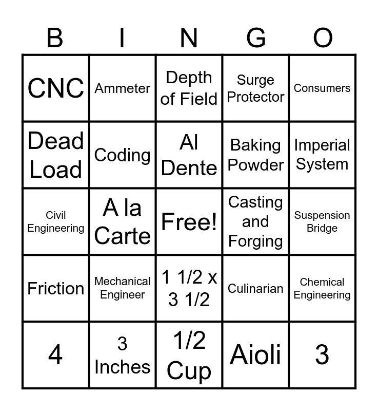 This bingo card has a free space and 54 words: Glider, Friction, Mass, Sill, 1 1/2 x 3 1/2, Developing, Surge Protector, 1 Horsepower, Dead Load, Horizontal, CNC, Toque, 3 Inches, 4, 8, 1/2 Cup, 3, Baking Powder, Gold Star Memorial Bridge, Suspension Bridge, Culinarian, Salt, Casting and Forging, Consumers, Specifications, Ammeter, Voltage, Lubricating, Chickpeas, Aioli, Truss Bridge, Top View, Long Hair, Exposure, Depth of Field, Aperture, Civil Engineering, Chemical Engineering, Programming, Coding, Robot, Robotics Engineering, Additive Manufacturing, Aerodynamics, Mechanical Engineer, Electrical Engineer, Apple Sauce, Brown Sugar, Al Dente, A la Carte, Imperial System, Mise en place, Water and Engineering.
