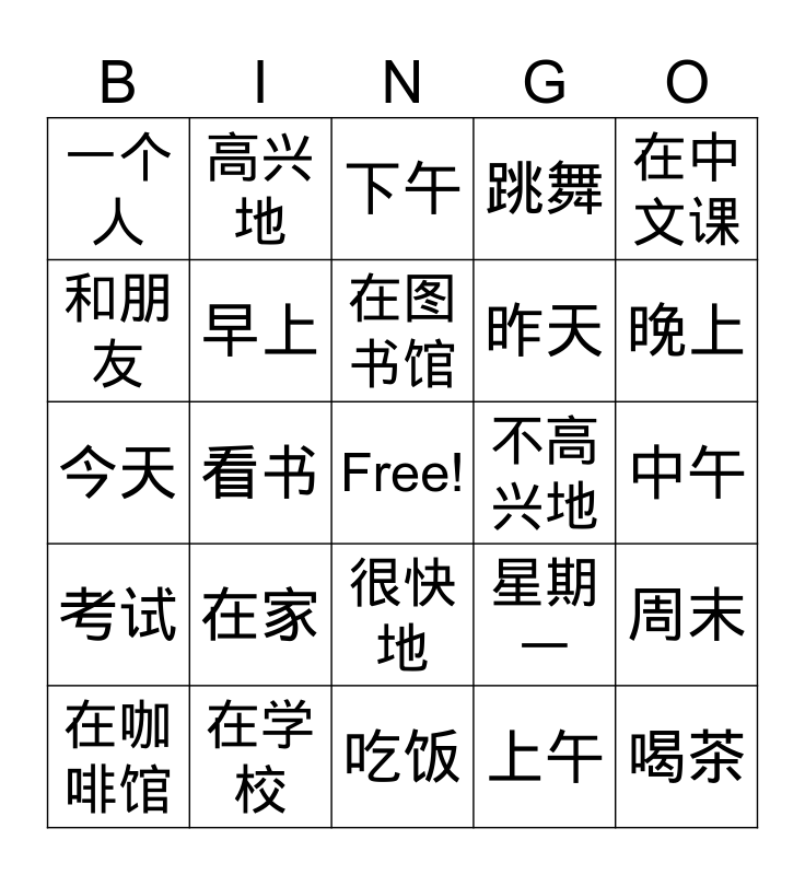 This bingo card has a free space and 24 words: 在家, 在学校, 在图书馆, 在咖啡馆, 在中文课, 一个人, 和朋友, 高兴地, 不高兴地, 很快地, 昨天, 今天, 星期一, 周末, 早上, 上午, 中午, 下午, 晚上, 看书, 喝茶, 考试, 跳舞 and 吃饭.
