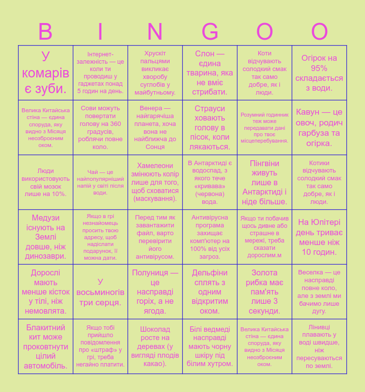 This bingo card has 36 words: Дельфіни сплять з одним відкритим оком., Полуниця — це насправді горіх, а не ягода., Білі ведмеді насправді мають чорну шкіру під білим хутром., Велика Китайська стіна — єдина споруда, яку видно з Місяця неозброєним оком., Медузи існують на Землі довше, ніж динозаври., В Антарктиді є водоспад, з якого тече «кривава» (червона) вода., Сови можуть повертати голову на 360 градусів, роблячи повне коло., Шоколад росте на деревах (у вигляді плодів какао)., Коти відчувають солодкий смак так само добре, як і люди., Золота рибка має пам'ять лише 3 секунди., Кавун — це овоч, родич гарбуза та огірка., Слон — єдина тварина, яка не вміє стрибати., Веселка — це насправді повне коло, але з землі ми бачимо лише дугу., Чай — це найпопулярніший напій у світі після води., Страуси ховають голову в пісок, коли лякаються., У комарів є зуби., Дорослі мають менше кісток у тілі, ніж немовлята., Пінгвіни живуть лише в Антарктиді і ніде більше., Люди використовують свій мозок лише на 10%., Хрускіт пальцями викликає хворобу суглобів у майбутньому., Хамелеони змінюють колір лише для того, щоб сховатися (маскування)., Якщо в грі незнайомець просить твою адресу, щоб надіслати подарунок, її можна дати., Антивірусна програма захищає комп'ютер на 100% від усіх загроз., Перед тим як завантажити файл, варто перевірити його антивірусом., Якщо ти побачив щось дивне або страшне в мережі, треба сказати дорослим.м, Інтернет-залежність — це коли ти проводиш у гаджетах понад 5 годин на день., Розумний годинник теж може передавати дані про твоє місцеперебування., Якщо тобі прийшло повідомлення про «штраф» у грі, треба негайно платити., Венера — найгарячіша планета, хоча вона не найближча до Сонця, Огірок на 95% складається з води., Лінивці плавають у воді швидше, ніж пересуваються по землі., Блакитний кит може проковтнути цілий автомобіль., На Юпітері день триває менше ніж 10 годин., Котики відчувають солодкий смак так само добре, як і люди., У восьминогів три серця. and Велика Китайська стіна — єдина споруда, яку видно з Місяця неозброєним оком..