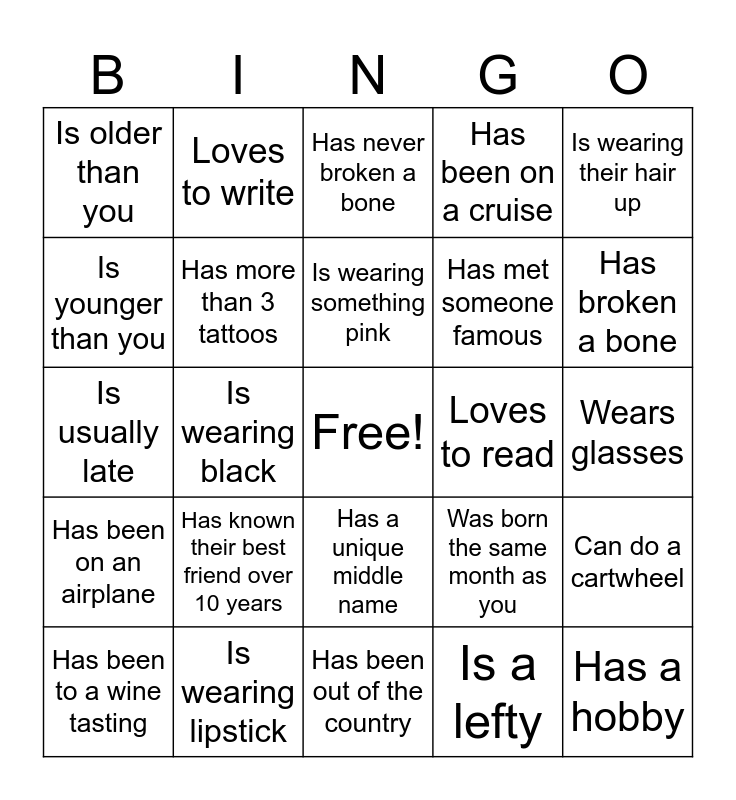 This bingo card has a free space and 24 words: Has known their best friend over 10 years, Is wearing lipstick, Is wearing something pink, Has been to a wine tasting, Is wearing their hair up, Is older than you, Is younger than you, Loves to write, Loves to read, Has a unique middle name, Has met someone famous, Is usually late, Was born the same month as you, Can do a cartwheel, Has more than 3 tattoos, Is a lefty, Wears glasses, Has never broken a bone, Has broken a bone, Is wearing black, Has a hobby, Has been on an airplane, Has been on a cruise and Has been out of the country.