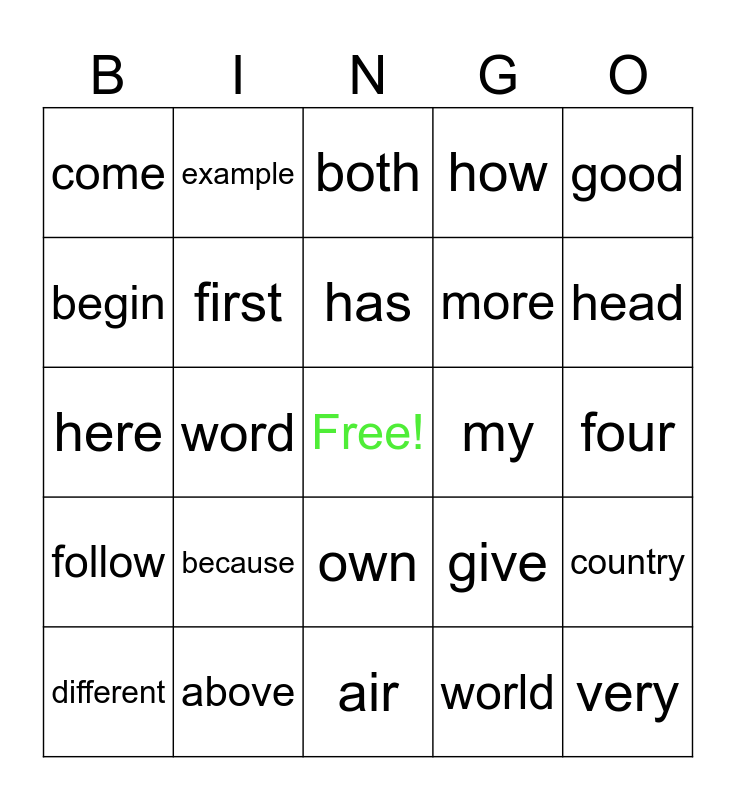 This bingo card has a free space and 28 words: country, earth, more, world, begin, both, example, follow, my, different, here, how, above, air, head, into, because, first, has, own, come, most, very, word, four, give, good and large.