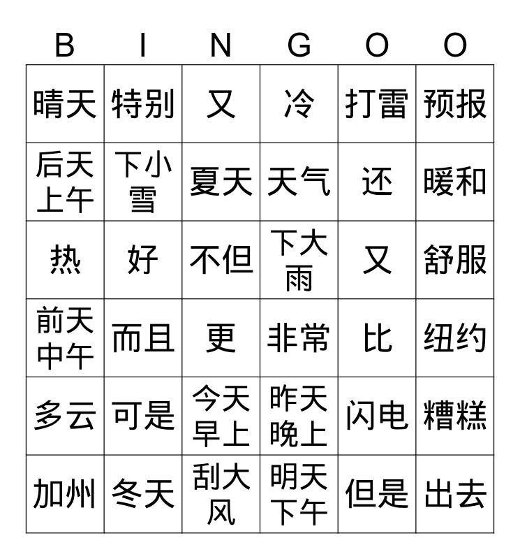 This bingo card has 36 words: 昨天 晚上, 今天早上, 明天下午, 后天上午, 前天 中午, 下大雨, 下小雪, 刮大风, 打雷, 闪电, 暖和, 冷, 糟糕, 好, 天气, 晴天, 多云, 又, 热, 又, 不但, 而且, 非常, 更, 比, 特别, 还, 冬天, 夏天, 预报, 出去, 加州, 纽约, 舒服, 可是 and 但是.