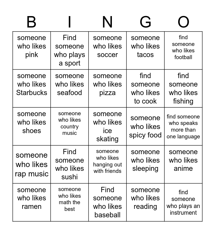 This bingo card has 35 words: someone who likes basketball, someone who likes cats, someone who likes movies, someone who likes seafood, someone who likes hanging out with friends, someone who likes tacos, someone who likes Starbucks, someone who likes traveling, someone who likes pizza, someone who likes video games, someone who likes shoes, find someone who likes football, find someone who likes dogs, find someone who likes cheerleading, someone who likes pink, someone who likes spicy food, someone who likes reading, someone who likes country music, someone who likes rap music, someone who likes ice skating, someone who likes sleeping, someone who likes ramen, someone who likes anime, someone who likes math the best, someone who likes soccer, find someone who likes fishing, find someone who plays an instrument, find someone who has the same number of siblings as you, find someone who likes to cook, find someone who speaks more than one language, Find someone who plays an instrument, Find someone who likes baseball, Find someone who likes sushi, Find someone who plays a sport and Find someone who doesn't like sports.