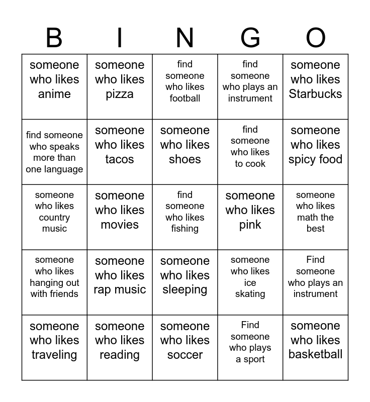 This bingo card has 33 words: someone who likes basketball, someone who likes cats, someone who likes movies, someone who likes seafood, someone who likes hanging out with friends, someone who likes tacos, someone who likes Starbucks, someone who likes traveling, someone who likes pizza, someone who likes video games, someone who likes shoes, find someone who likes football, find someone who likes dogs, find someone who likes cheerleading, someone who likes pink, someone who likes spicy food, someone who likes reading, someone who likes country music, someone who likes rap music, someone who likes ice skating, someone who likes sleeping, someone who likes ramen, someone who likes anime, someone who likes math the best, someone who likes soccer, find someone who likes fishing, find someone who plays an instrument, find someone who likes to cook, find someone who speaks more than one language, Find someone who plays an instrument, Find someone who likes sushi, Find someone who plays a sport and Find someone who doesn't like sports.