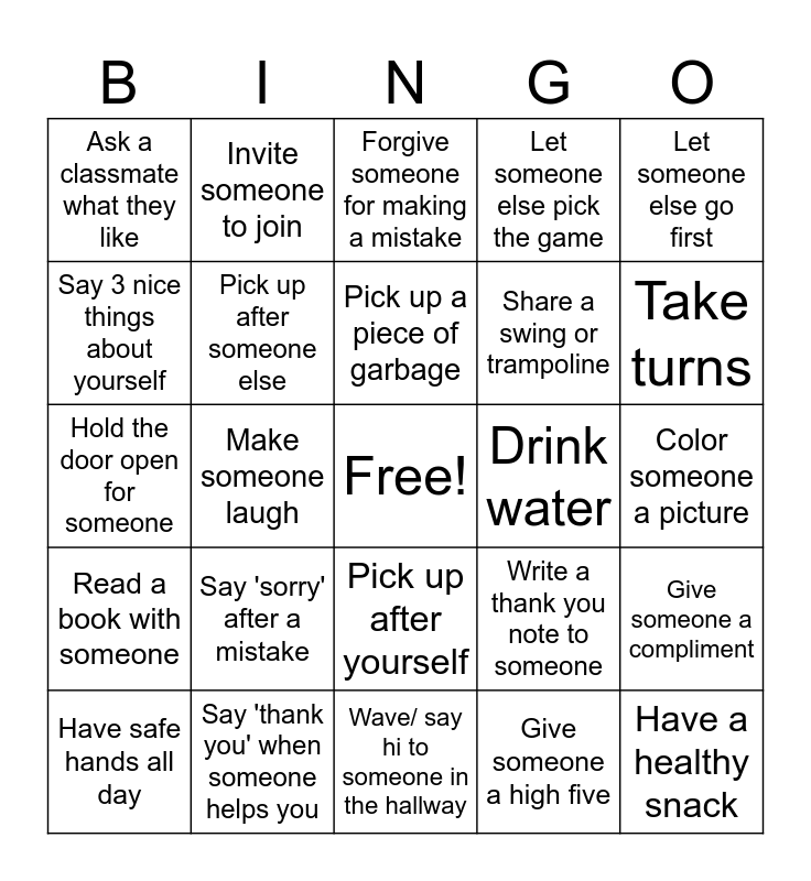 This bingo card has a free space and 24 words: Say 'sorry' after a mistake, Say 'thank you' when someone helps you, Pick up a piece of garbage, Have safe hands all day, Let someone else go first, Ask a classmate what they like, Say 3 nice things about yourself, Invite someone to join, Drink water, Pick up after yourself, Share a swing or trampoline, Hold the door open for someone, Write a thank you note to someone, Give someone a compliment, Pick up after someone else, Give someone a high five, Color someone a picture, Forgive someone for making a mistake, Take turns, Make someone laugh, Have a healthy snack, Read a book with someone, Let someone else pick the game and Wave/ say hi to someone in the hallway.