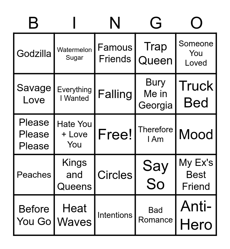 This bingo card has a free space and 39 words: Adore You, Memories, The Bones, Everything I Wanted, Before You Go, Circles, Falling, If the World Was Ending, Someone You Loved, Peaches, Hate You + Love You, Trap Queen, Anti-Hero, Mood, Therefore I Am, Kings and Queens, Rockstar, Godzilla, She Had Me At Heads Carolina, Say So, Savage Love, Intentions, Bury Me in Georgia, Truck Bed, Break My Heart, Need A Favor, Don’t Start Now, Rain On Me, Dynamite, Watermelon Sugar, Fancy Like, Dance Monkey, Famous Friends, Heat Waves, Bad Romance, Drivers License, My Ex's Best Friend, Please Please Please and What I Want.
