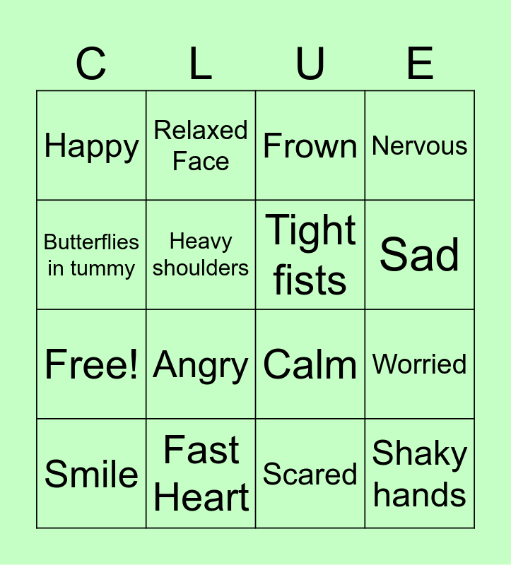 This bingo card has 20 words: Worried, Wide Eyes, Frown, Laughing, Smile, Butterflies in tummy, Fast Heart, Happy, Free!, Relaxed Face, Angry, Calm, Heavy shoulders, Shaky hands, Tight fists, Mind spinning, Sad, Nervous, Scared and Sweaty.