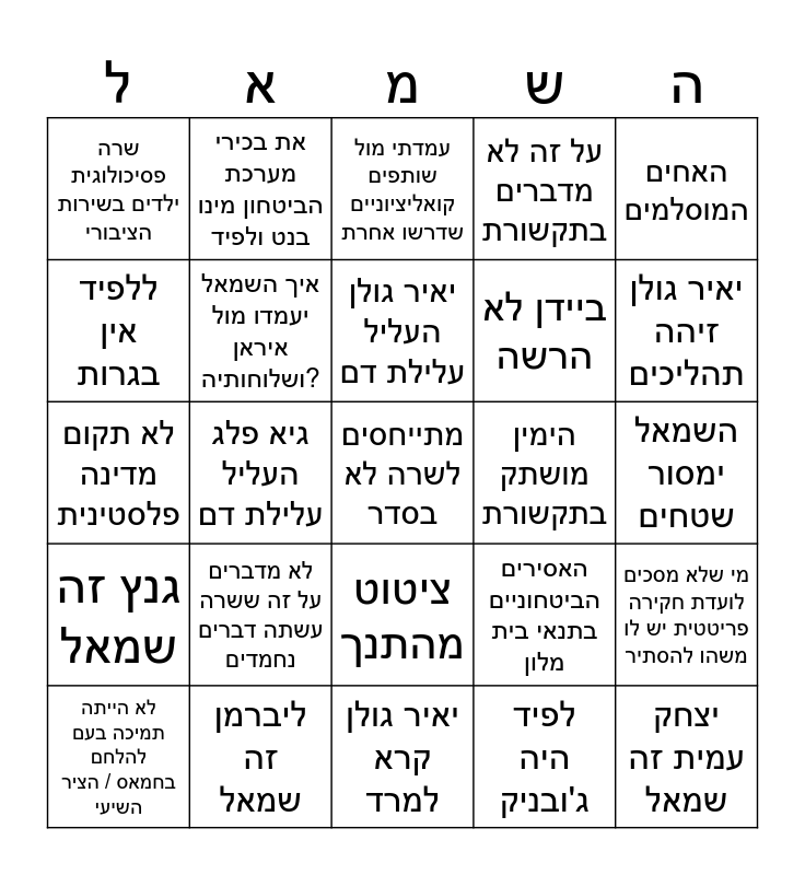 This bingo card has 113 words: הנחיתי, אפילו שבכירים במערכת אמרו לי ש-, אפילו שיריביי הפוליטיים אמרו ש-, ברק ואפשטיין, תקומה, טראמפ אוהב את נתניהו, על זה לא מדברים בתקשורת, הקונספציה, שופטים שלא נבחרו, פקידים שלא נבחרו, בגצ, יועמשית, פצרית, אוסלו / קורבנות השלום, הניצחון המוחלט, אני שומע אמירות ש-, ציטוט מהתנך, הסכם הגרעין של אובמה, (שר אומר) ראש הממשלה ואני, בגלל שבנט ולפיד היו ראשי ממשלה לדקה, לא הייתה תמיכה בעם להלחם בחמאס / הציר השיעי, עמדתי מול שותפים קואליציוניים שדרשו אחרת, האחים המוסלמים לא ייתנו לתקוף, ברור שאני מגנה את זה, אבל -, בנט זה שמאל, גנץ זה שמאל, ליברמן זה שמאל, אייזנקוט זה שמאל, לפיד זה שמאל, ההתנתקות, יאיר גולן זיהה תהליכים, יאיר גולן העליל עלילת דם, גיא פלג העליל עלילת דם, לשמאל מותר לחסום את איילון / לחסום אנשים, לפיד נתן שטח ישראלי ללבנון, כסף לאחים המוסלמים, חוק הגיוס יגייס חרדים, הסקר האמיתי היה בקלפי, הסקר האמיתי יהיה בקלפי, פקידים שלא נבחרו, לא העירו אותי, נתניהו הביא חיסונים, סרבנות, הסכמי אברהם, המפגינים אנרכיסטים, למה זה לא במהדורות?, לפיד היה ג'ובניק, ללפיד אין בגרות, התקשורת מלטפת כלפי השמאל, גם רבין לא אהב את בגצ, למה לא מדברים על (פרשה ישנה של פוליטיקאי שכבר לא במערכת), הימין מושתק בתקשורת, איזה יופי נתניהו החזיר את החטופים, איזה יופי נתניהו מוטט את הציר האיראני, הכלכלה פורחת, בעזה לא יהיה חמאס ולא רש"פ, יצחק עמית זה שמאל, העם לא מאמין בועדה שיקים יצחק עמית, יצחק עמית מינה את עצמו / הוא לא נשיא העליון, ועדת חקירה פריטטית זה ועדה שכולם מאמינים בה, מי שלא מסכים לועדת חקירה פריטטית יש לו משהו להסתיר, מי בכלל קבע שועדת חקירה זה ממלכתי?, התיקים קורסים, נתניהו לא יכול לנהל מדינה ומשפט בו"ז (למרות שהבטיח שכן), טראמפ דרש חנינה, הרצוג אמר לטראמפ שייתן חנינה, איזה יופי נתניהו דאג למפונים במלחמה, איך השמאל יעמדו מול איראן ושלוחותיה?, לא תקום מדינה פלסטינית, השמאל יקים מדינה פלסטינית, השמאל ימסור שטחים, טראמפ ביקש מהרצוג חנינה, נתניהו עומד מול לחץ מהעולם, בלי לומדי התורה לא היינו קיימים, אם בנט/לפיד היו בשלטון ה7/10 היה גרוע הרבה יותר, מתייחסים לשרה לא בסדר, לא מדברים על זה ששרה עשתה דברים נחמדים, שרה פסיכולוגית ילדים בשירות הציבורי, הרצי, רונן בר, חליוה, את בכירי מערכת הביטחון מינו בנט ולפיד, אמרו על זיני שהוא משיחי, האסירים הביטחוניים בתנאי בית מלון, ביידן לא הרשה, ביידן הטיל אמברגו, גנץ התגאה שסיכן חיילי גולני, אשתו של בנט הייתה קונדיטורית לא כשרה, "כל מי שאמרו צבא קטן וחכם", (חשוד/נאשם) הוא פטריוט ישראלי ציוני נלהב, לפיד נתן שטח ישראל לחיזבאללה, גנץ נפגש עם אבו מאזן, האחים המוסלמים, מס עבאס, המימד החמישי, לא דיווחו על דבר חיובי שהקואליציה עשתה, ליברמן = שמאל, הסקר האמיתי היה בקלפי, שופטים שלא נבחרו, פקידים שלא נבחרו, התקשורת מלטפת את האופוזיציה, אוסלו, אהוד ברק חבר של פדופיל, מסע ציד, המחאה קראה למרד, ברק קרא למרד, יאיר גולן קרא למרד, מתיימרים להיות אבירי חופש הביטוי, לא מדווחים על דברים חיוביים ששרה עושה, מסיתים נגד ראש הממשלה, סרבנות, מסיתים נגד חרדים and המשטרה הייתה רכה מדי עם המפגינים.