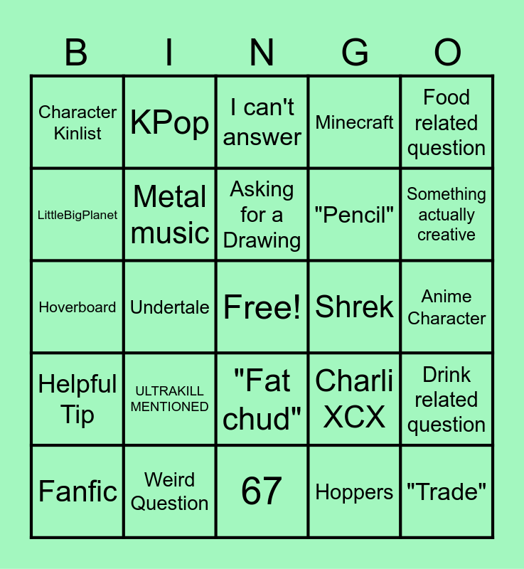 This bingo card has a free space and 24 words: ULTRAKILL MENTIONED, Weird Question, Asking for a Drawing, Fanfic, Food related question, Character Kinlist, LittleBigPlanet, KPop, Shrek, "Fat chud", "Pencil", Hoverboard, Charli XCX, Drink related question, Metal music, Hoppers, Anime Character, I can't answer, Something actually creative, Undertale, "Trade", Helpful Tip, Minecraft and 67.