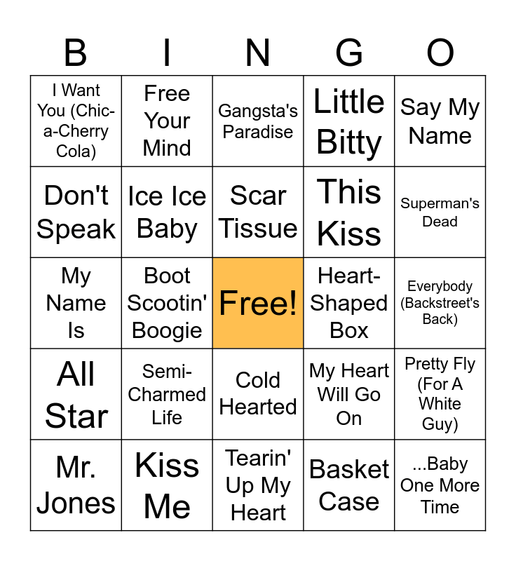 This bingo card has a free space and 29 words: Mr. Jones, Wannabe, Boot Scootin' Boogie, Hand in my Pocket, I Want You (Chic-a-Cherry Cola), Gangsta's Paradise, Ice Ice Baby, Semi-Charmed Life, Heart-Shaped Box, Kiss Me, Everybody (Backstreet's Back), ...Baby One More Time, Tearin' Up My Heart, Basket Case, Superman's Dead, All The Small Things, Cold Hearted, All Star, Say My Name, My Name Is, My Heart Will Go On, Man! I Feel Like a Woman!, This Kiss, Don't Speak, Little Bitty, Free Your Mind, Pretty Fly (For A White Guy), Scar Tissue and Livin' la Vida Loca.