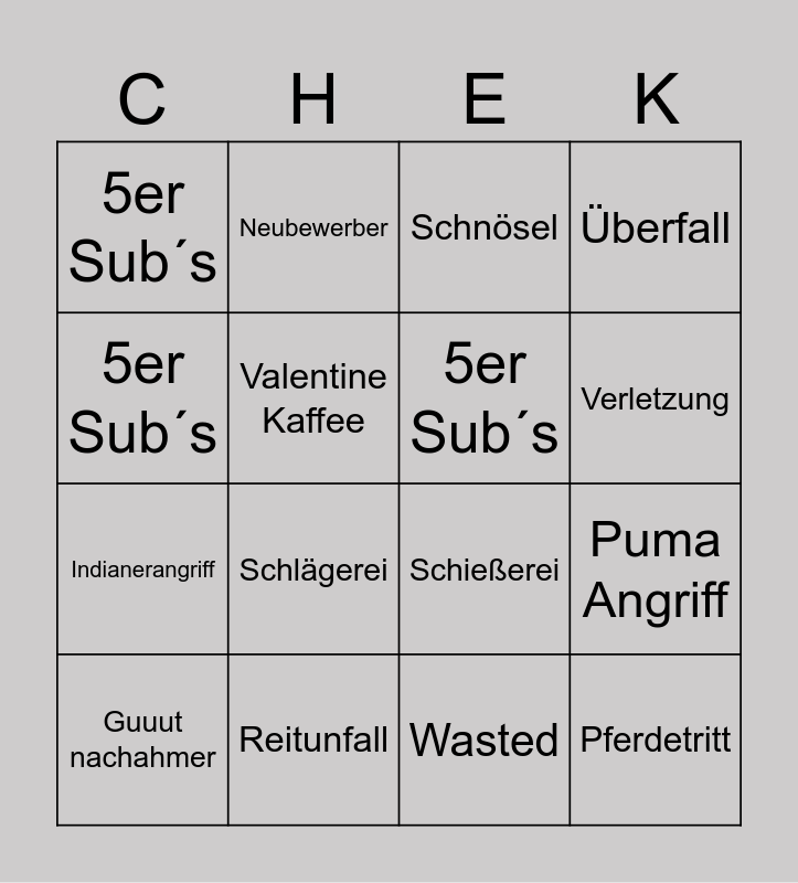 This bingo card has 16 words: Reitunfall, Puma Angriff, Schnösel, 5er Sub´s, Indianerangriff, Neubewerber, Schießerei, Wasted, 5er Sub´s, Valentine Kaffee, Guuut nachahmer, Überfall, Schlägerei, Verletzung, 5er Sub´s and Pferdetritt.