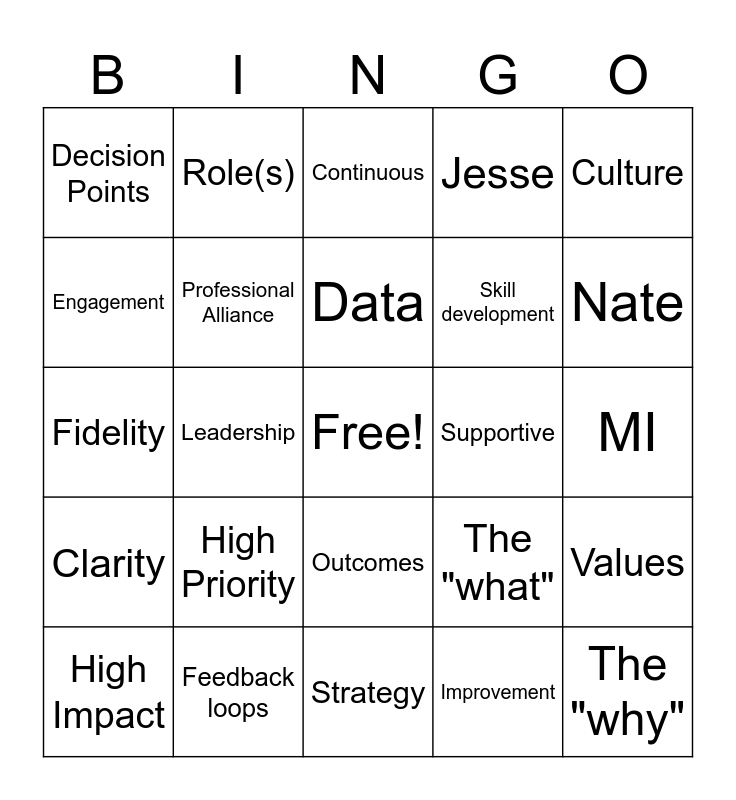 This bingo card has a free space and 24 words: High Priority, Feedback loops, Data, High Impact, Culture, Decision Points, Engagement, Role(s), Supportive, Outcomes, Skill development, Fidelity, The "what", Values, Professional Alliance, Improvement, MI, Continuous, Nate, Leadership, The "why", Clarity, Jesse and Strategy.