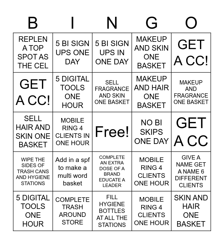 This bingo card has a free space and 24 words: Add in a spf to make a multi word basket, COMPLETE TRASH AROUND STORE, SELL FRAGRANCE AND SKIN ONE BASKET, 5 DIGITAL TOOLS ONE HOUR, GET A CC!, REPLEN A TOP SPOT AS THE CEL, GET A CC!, 5 BI SIGN UPS ONE DAY, NO BI SKIPS ONE DAY, COMPLETE AN EXTRA DOSE OF A BRAND EDUCATE A LEADER, MAKEUP AND HAIR ONE BASKET, SELL HAIR AND SKIN ONE BASKET, MOBILE RING 4 CLIENTS ONE HOUR, GIVE A NAME GET A NAME 6 DIFFERENT CLIENTS, 5 DIGITAL TOOLS ONE HOUR, MOBILE RING 4 CLIENTS ONE HOUR, GET A CC, 5 BI SIGN UPS IN ONE DAY, MAKEUP AND FRAGRANCE ONE BASKET, MOBILE RING 4 CLIENTS IN ONE HOUR, SKIN AND HAIR ONE BASKET, WIPE THE SIDES OF TRASH CANS AND HYGIENE STATIONS, MAKEUP AND SKIN ONE BASKET and FILL HYGIENE BOTTLES AT ALL THE STATIONS.