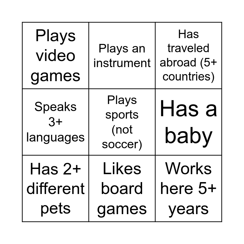 This bingo card has 9 words: Has 2+ different pets, Has traveled abroad (5+ countries), Plays an instrument, Speaks 3+ languages, Plays video games, Has a baby, Plays sports (not soccer), Works here 5+ years and Likes board games.