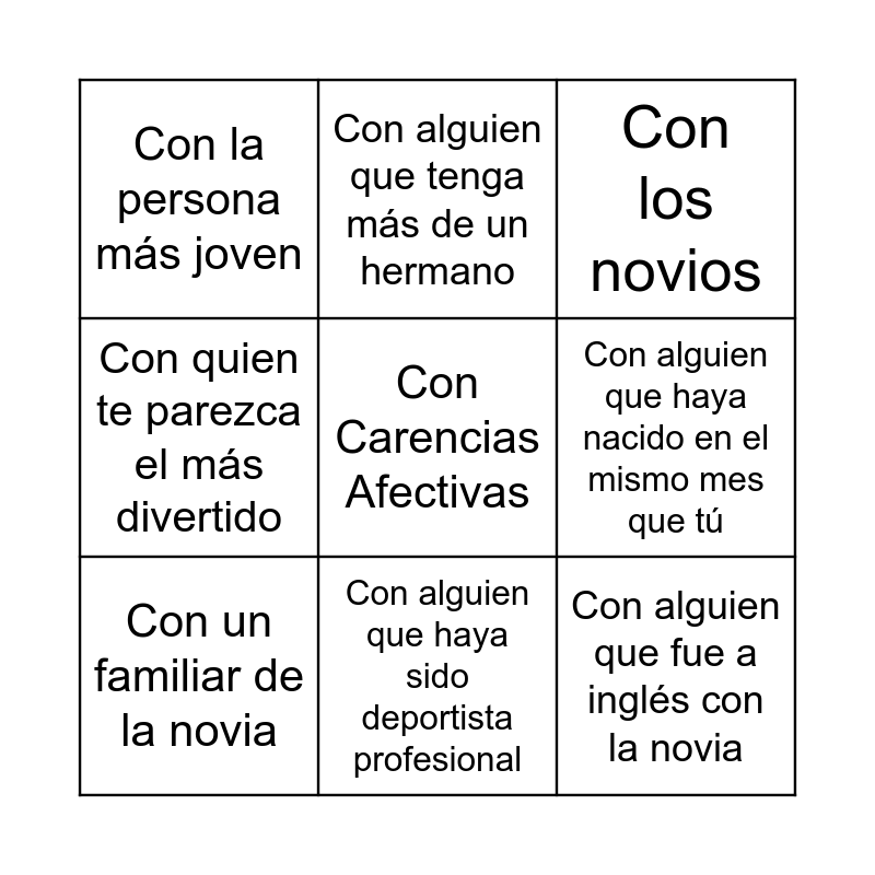 This bingo card has 83 words: Con la novia, Con el novio, Con los novios, Con el Grupillo Troll, Free!, Con todos los psiquiatras, Con la que más mola de Fuerteventura, Cantando karaoke, Con todos los accesorios de fiesta que puedas, Con el barril, En tu kigurumi, Con los próximos novios, Con un familiar de la novia, Con un familiar del novio, Con un vegetariano, Con la persona más joven, Con alguien que haya vivido en el extranjero, Con alguien que haya nacido en el mismo mes que tú, Un Brindis, Con alguien que fue a la universidad con el novio, Con alguien que fue a la universidad con la novia, Con alguien que fue a inglés con la novia, Con alguien que ha ido a un concierto de Rebelde Way, Con 3 personas que no se conocían hasta hoy, Con la cara pintada, Con la cara llena de tatuajes, Con algo que te recuerde a la novia, Con algo que te recuerde al novio, En tu habitación, Con el cartel del pueblo, Con alguien que comparta tu signo del zodiaco, Con alguien que sea de tu signo opuesto, Con un zurdo, Con alguien que no sea ni de Cantabria ni de Madrid, Tu kigorumi favorito, Robado a los novios, Con quien lleve el mejor outfit, Con alguien cuya madre se llame Isabel, Con alguien que conociera a los novios cuando todavía no eran pareja (Chuela con sus maricones), Lo más de pueblo que encuentres, Lo más cántabro que encuentres, Un rincón pintoresco, La puesta de sol, Alguien durmiendo, Con el polvo de estrellas, Con alguien que pueda arreglarte un empaste, Con alguien que tenga más de un hermano, Con alguien que tenga perro, Con alguien que haya sacado nota negativa en un examen, Con alguien que te caía mal cuando le conociste, Con alguien que se haya casado en 2025, Con quien te parezca el más divertido, Con alguien del Barça, Con alguien del Madrid, Con alguien del Racing, Con La suma sacerdotisa de las bumping gaitas, Con la fotógrafa, Con quien haya ido a ambas despedidas, Con un pequeño unicornio, Con un guardia de Águila Roja, Con la pareja de pádel del novio, Con la fan nº1 de David Bisbal, Con alguien que haya publicado un libro, Con Carencias Afectivas, Con alguien que sepa asaltar un barco, Con los gallegos, Con las Caminantes Blancas, Con la mejor coR, Con los testigos, Foto de grupo choni en un espejo, Con el Team Enfermería, Con el más alto y el más bajo, Con alguien que haya vivido con los novios, Con alguien que haya publicado un libro, Con la pareja de pádel del novio, Con alguien que haya conducido un tren, Con quien haya mandado a un árbitro a la nevera, Con alguien que haya sido deportista profesional, Con alguien que haya estado en una boda judía, Con quien susurra a las moscas, Con el empresario de año, Con la Gildadicta máxima and Con alguien que haya vivido con los novios.