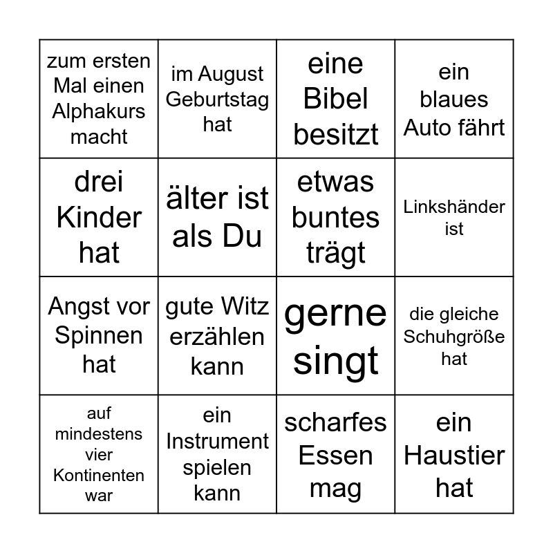 This bingo card has 16 words: ein Instrument spielen kann, die gleiche Schuhgröße hat, eine Bibel besitzt, zum ersten Mal einen Alphakurs macht, Angst vor Spinnen hat, im August Geburtstag hat, gerne singt, scharfes Essen mag, drei Kinder hat, älter ist als Du, auf mindestens vier Kontinenten war, ein blaues Auto fährt, gute Witz erzählen kann, Linkshänder ist, etwas buntes trägt and ein Haustier hat.