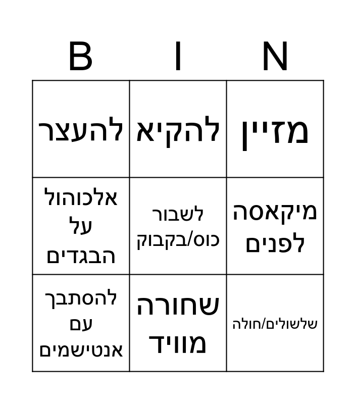 This bingo card has a free space and 8 words: מיקאסה לפנים, מזיין, להקיא, להסתבך עם אנטישמים, להעצר, שלשולים/חולה, אלכוהול על הבגדים and שחורה מוויד.