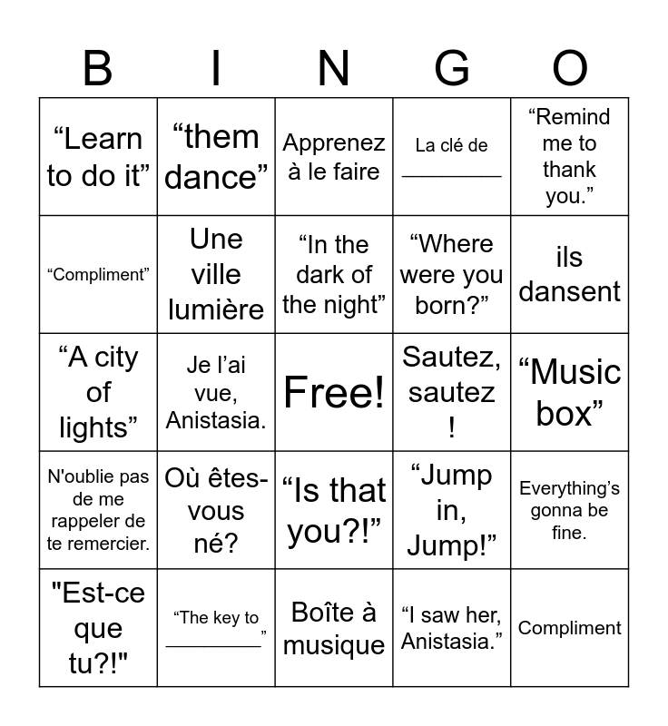 This bingo card has a free space and 26 words: “Is that you?!”, “I saw her, Anistasia.”, “In the dark of the night”, “The key to __________”, “Remind me to thank you.”, “Learn to do it”, “Compliment”, “them dance”, “Music box”, “Jump in, Jump!”, “Where were you born?”, “A city of lights”, Everything’s gonna be fine., "Est-ce que tu?!", Je l’ai vue, Anistasia., Dans l’obscurité de la nuit, La clé de __________, N'oublie pas de me rappeler de te remercier., Apprenez à le faire, Compliment, ils dansent, Boîte à musique, Sautez, sautez !, Où êtes-vous né?, Une ville lumière and Tout va bien se passer..