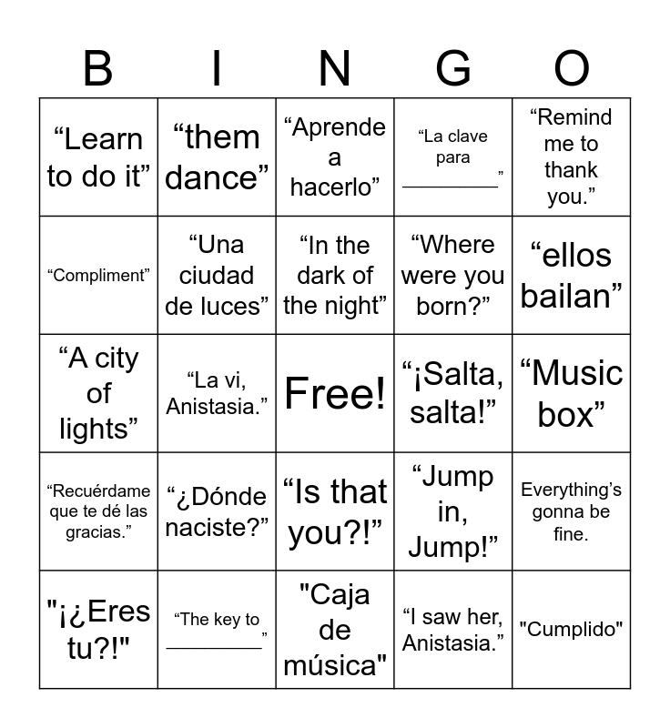 This bingo card has a free space and 26 words: “Is that you?!”, “I saw her, Anistasia.”, “In the dark of the night”, “The key to __________”, “Remind me to thank you.”, “Learn to do it”, “Compliment”, “them dance”, “Music box”, “Jump in, Jump!”, “Where were you born?”, “A city of lights”, Everything’s gonna be fine., "¡¿Eres tu?!", “La vi, Anistasia.”, “En la oscuridad de la noche”, “La clave para __________”, “Recuérdame que te dé las gracias.”, “Aprende a hacerlo”, "Cumplido", “ellos bailan”, "Caja de música", “¡Salta, salta!”, “¿Dónde naciste?”, “Una ciudad de luces” and Todo va a estar bien..