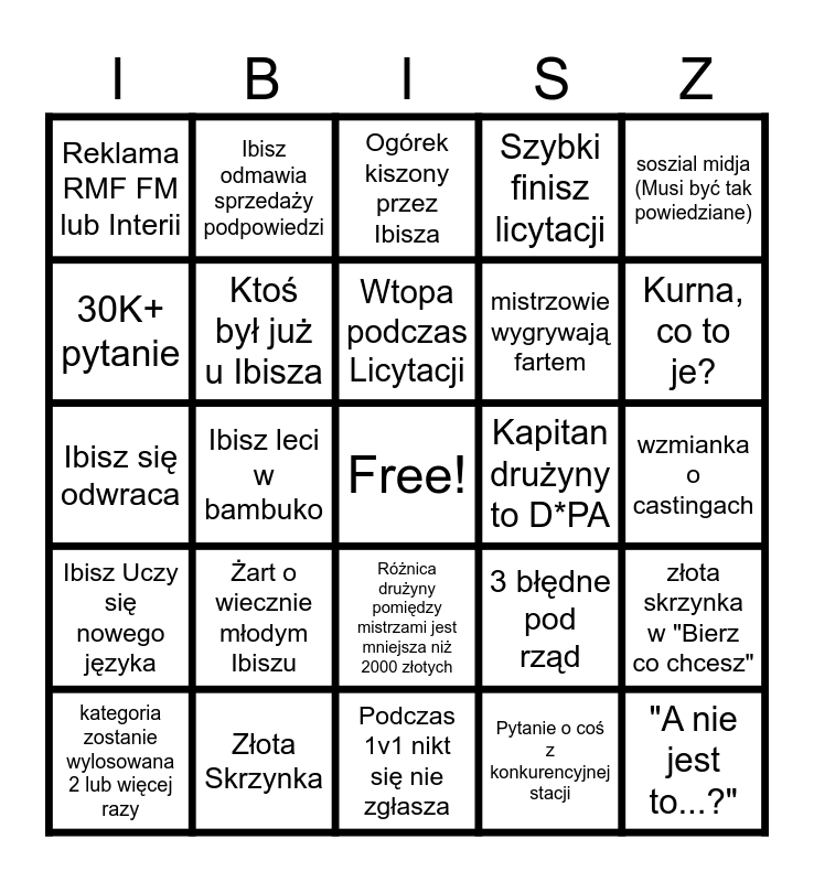This bingo card has a free space and 24 words: Żart o wiecznie młodym Ibiszu, Złota Skrzynka, Wtopa podczas Licytacji, kategoria zostanie wylosowana 2 lub więcej razy, soszial midja (Musi być tak powiedziane), Reklama RMF FM lub Interii, 30K+ pytanie, Ibisz odmawia sprzedaży podpowiedzi, Kapitan drużyny to D*PA, Różnica drużyny pomiędzy mistrzami jest mniejsza niż 2000 złotych, mistrzowie wygrywają fartem, Ibisz się odwraca, 3 błędne pod rząd, złota skrzynka w "Bierz co chcesz", Ktoś był już u Ibisza, Pytanie o coś z konkurencyjnej stacji, wzmianka o castingach, Ogórek kiszony przez Ibisza, Kurna, co to je?, Ibisz leci w bambuko, "A nie jest to...?", Ibisz Uczy się nowego języka, Szybki finisz licytacji and Podczas 1v1 nikt się nie zgłasza.