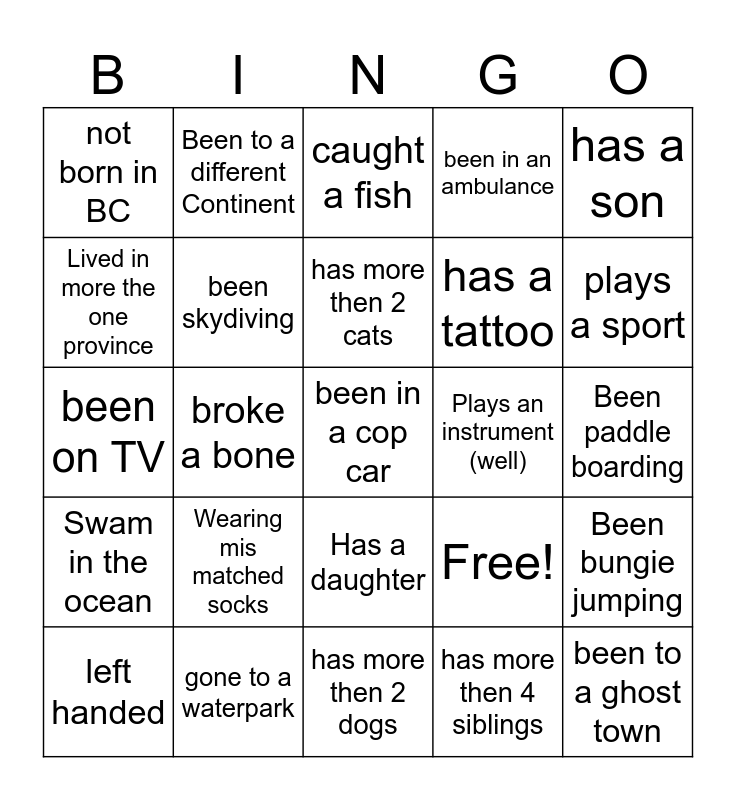 This bingo card has 25 words: Wearing mis matched socks, has more then 2 dogs, has more then 2 cats, left handed, has a son, not born in BC, Lived in more the one province, Been to a different Continent, Plays an instrument (well), Has a daughter, has a tattoo, been on TV, Free!, Been bungie jumping, been skydiving, been to a ghost town, Been paddle boarding, caught a fish, plays a sport, broke a bone, been in a cop car, gone to a waterpark, Swam in the ocean, been in an ambulance and has more then 4 siblings.