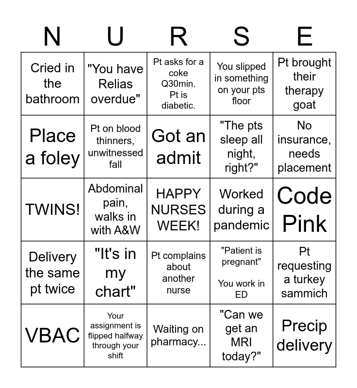 This bingo card has a free space and 24 words: "It's in my chart", Your assignment is flipped halfway through your shift, Got an admit, VBAC, Pt brought their therapy goat, Cried in the bathroom, Place a foley, "You have Relias overdue", Worked during a pandemic, Pt complains about another nurse, "The pts sleep all night, right?", TWINS!, "Patient is pregnant" You work in ED, Pt requesting a turkey sammich, Pt on blood thinners, unwitnessed fall, "Can we get an MRI today?", Code Pink, Pt asks for a coke Q30min. Pt is diabetic., No insurance, needs placement, Abdominal pain, walks in with A&W, Precip delivery, Delivery the same pt twice, You slipped in something on your pts floor and Waiting on pharmacy....