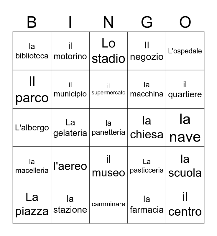 This bingo card has 35 words: il bar, il centro commerciale, il cinema, il municipio, il museo, Il negozio, Il parco, il ristorante, il supermercato, l'aeroporto, L'albergo, L'ospedale, L'ufficio postale, la banca, la biblioteca, la chiesa, la farmacia, La gelateria, la macelleria, la panetteria, La pasticceria, La piazza, la scuola, la stazione, Lo stadio, il quartiere, il centro, la barca, la macchina, la nave, il treno, camminare, l'aereo, il motorino and la bicicletta.