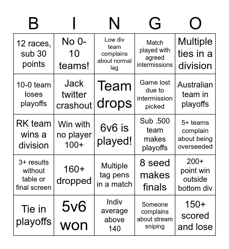 This bingo card has a free space and 24 words: 160+ dropped, 5v6 won, Team drops, Tie in playoffs, Multiple ties in a division, 12 races, sub 30 points, 10-0 team loses playoffs, No 0-10 teams!, Sub .500 team makes playoffs, Multiple tag pens in a match, Game lost due to intermission picked, RK team wins a division, 8 seed makes finals, 200+ point win outside bottom div, Jack twitter crashout, Someone complains about stream sniping, 5+ teams complain about being overseeded, Low div team complains about normal lag, Australian team in playoffs, Win with no player 100+, 150+ scored and lose, 3+ results without table or final screen, Match played with agreed intermissions and Indiv average above 140.