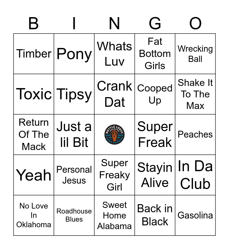 This bingo card has a free space and 24 words: Personal Jesus, Roadhouse Blues, Crank Dat, No Love In Oklahoma, Wrecking Ball, Timber, Toxic, Pony, Super Freak, Super Freaky Girl, Cooped Up, Return Of The Mack, Stayin Alive, In Da Club, Tipsy, Back in Black, Peaches, Whats Luv, Shake It To The Max, Just a lil Bit, Gasolina, Yeah, Fat Bottom Girls and Sweet Home Alabama.