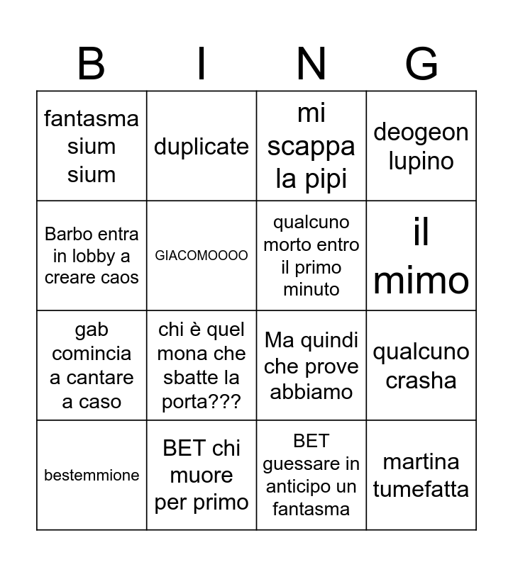 This bingo card has 16 words: BET chi muore per primo, qualcuno crasha, mi scappa la pipi, fantasma sium sium, gab comincia a cantare a caso, duplicate, Ma quindi che prove abbiamo, BET guessare in anticipo un fantasma, Barbo entra in lobby a creare caos, GIACOMOOOO, bestemmione, deogeon lupino, chi è quel mona che sbatte la porta???, il mimo, qualcuno morto entro il primo minuto and martina tumefatta.
