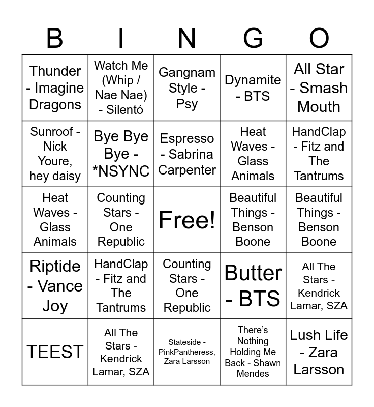 ⚠ This card has duplicate items: Notion - The Rare Occasions (2), Lush Life - Zara Larsson (2), I Want It That Way - Backstreet Boys (2), Stateside - PinkPantheress, Zara Larsson (2), HandClap - Fitz and The Tantrums (2), Chk Chk Boom - Stray Kids (2), Watch Me (Whip / Nae Nae) - Silentó (2), Dynamite - BTS (2), Sunroof - Nick Youre, hey daisy (2), Lucis Dreams - Juice WRLD (2), Bye Bye Bye - *NSYNC (2), Gangnam Style - Psy (2), All The Stars - Kendrick Lamar, SZA (2), Butter - BTS (2), Happier - Marshmello, Bastille (2), Golden - HUNTR/X (2), Espresso - Sabrina Carpenter (2), Beautiful Things - Benson Boone (2), Riptide - Vance Joy (2), All Star - Smash Mouth (2), Counting Stars - One Republic (2), There’s Nothing Holding Me Back - Shawn Mendes (2), Thunder - Imagine Dragons (2), Heat Waves - Glass Animals (2)