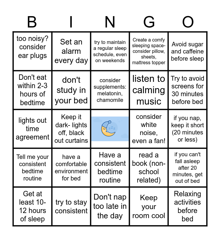 This bingo card has a free space and 29 words: Get at least 10-12 hours of sleep, manage anxiety, Keep it dark- lights off, black out curtains, no TikTok, Instagram, Facebook, YouTube, etc right before bed, too noisy? consider ear plugs, try to maintain a regular sleep schedule, even on weekends, don't study in your bed, have a comfortable environment for bed, consider white noise, even a fan!, try to stay consistent, if you nap, keep it short (20 minutes or less), Relaxing activities before bed, Don't nap too late in the day, Keep your room cool, Try to avoid screens for 30 minutes before bed, Turn down brightness on screens, Have a consistent bedtime routine, Tell me your consistent bedtime routine, Avoid sugar and caffeine before sleep, lights out time agreement, read a book (non-school related), try yoga or meditation, listen to calming music, Don't eat within 2-3 hours of bedtime, Create a comfy sleeping space- consider pillow, sheets, mattress topper, Set an alarm every day, if you can't fall asleep after 20 minutes, get out of bed, consider supplements: melatonin, chamomile and Not sleeping well? Consider seeing a provider.