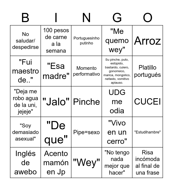 This bingo card has a free space and 27 words: "Vivo en un cerro", "De aquí soy", Su pinche, puto, estúpido, bastardo, culero, gonorreico, marica, mongolico, nefasto, vomitivo aplauso., "Wey", "Fui maestro de..", Portuguesinho putinho, 100 pesos de carne a la semana, "Soy demasiado asexual", UDG me odia, "Estudihambre", "Deja me robo agua de la uni, jejeje", "Me quemo wey", Inglés de awebo, Acento mamón en Jp, Platillo portugués, Piernas modo reposo, "Esa madre", Momento performativo, "De que", No saludar/ despedirse, CUCEI, "No tengo nada mejor que hacer", "Jalo", Risa incómoda al final de una frase, Pipe=sexo, Arroz and Pork belly.