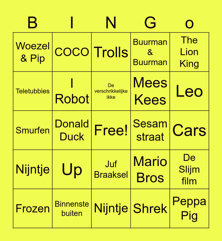 This bingo card has a free space and 24 words: Up, Binnenste buiten, De verschrikkelijke ikke, Frozen, The Lion King, Woezel & Pip, Teletubbies, COCO, Sesam straat, Juf Braaksel, Mees Kees, Smurfen, Mario Bros, De Slijm film, I Robot, Shrek, Cars, Trolls, Leo, Donald Duck, Peppa Pig, Nijntje, Buurman & Buurman and Nijntje.