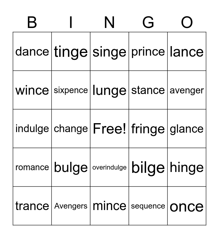 This bingo card has a free space and 34 words: fence, sequence, advance, hence, romance, sixpence, lance, trance, tinge, cringe, lunge, singe, plunge, scavenge, fringe, avenger, Avengers, indulge, bulge, bilge, overindulge, Chance, dance, glance, mince, once, prince, since, stance, wince, binge, change, hinge and stranger.